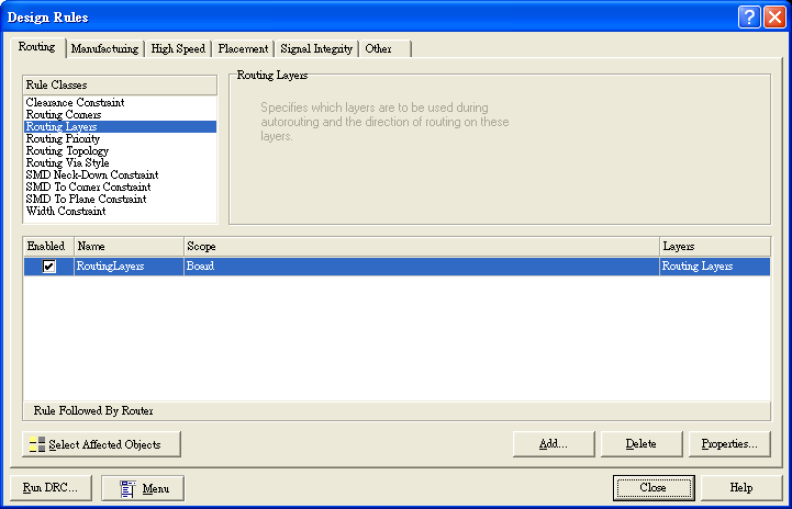 因列舉電路不是很複雜關系,所以我們用單面版就可以布線完成,而通常PROTEL里預設版面是以雙面來進行布線,所以我們要選擇成單面布線。選擇上方主目錄中Design→Rules出現對話框后,選到Routing Layers后,進入右下角的設定Properties,如圖18。